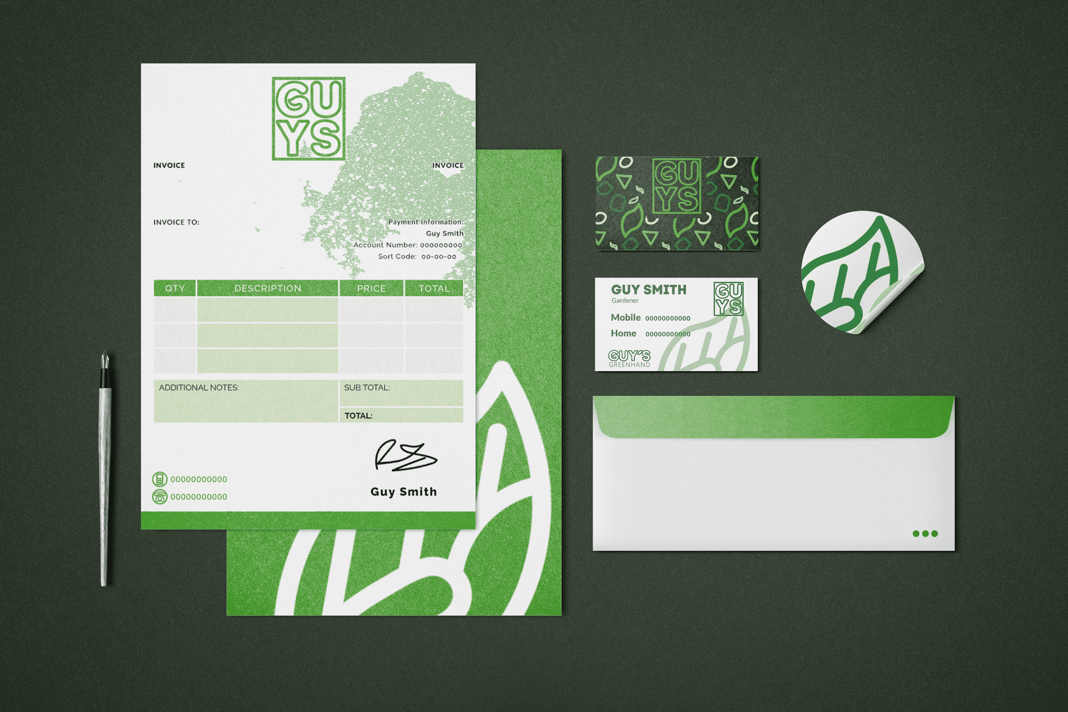 I created a bold and masculine brand identity for Guy, who has a sole trading gardening business, which he works hard at and has incredible attention to detail for the jobs he does. To go with the branding I also made custom branded invoices to help Guy stay professional and organised. Guy has since got back to me and says the branding and invoices have been extremely useful and very well recieved by his customers.